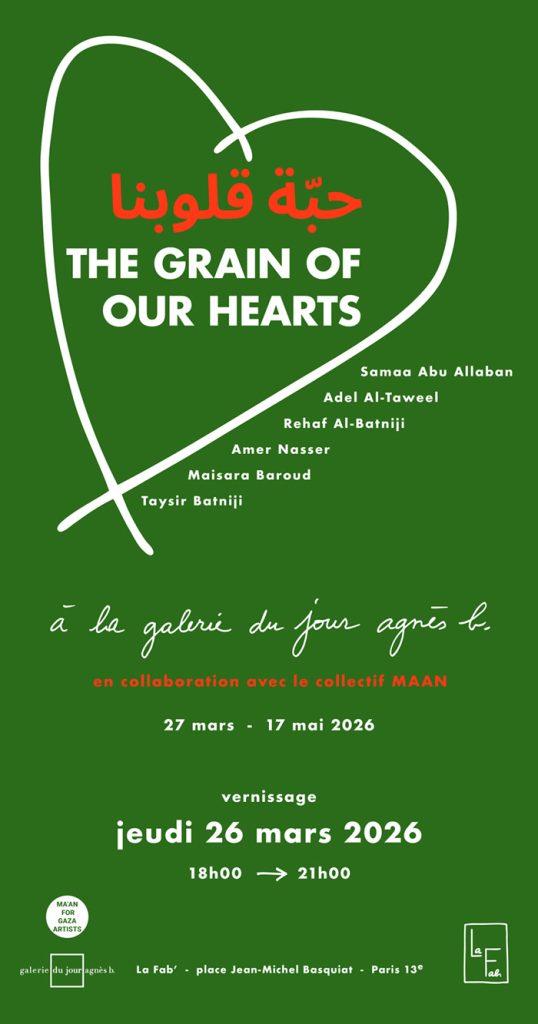 Pour cette exposition collective, la Galerie du Jour agnès b. s’associe au collectif MAAN for Gaza Artists. Le Collectif MAAN (« Ensemble ») a été fondé en octobre 2023 à la suite de l’exposition Ce que la Palestine apporte au monde à l’Institut du Monde Arabe à Paris.